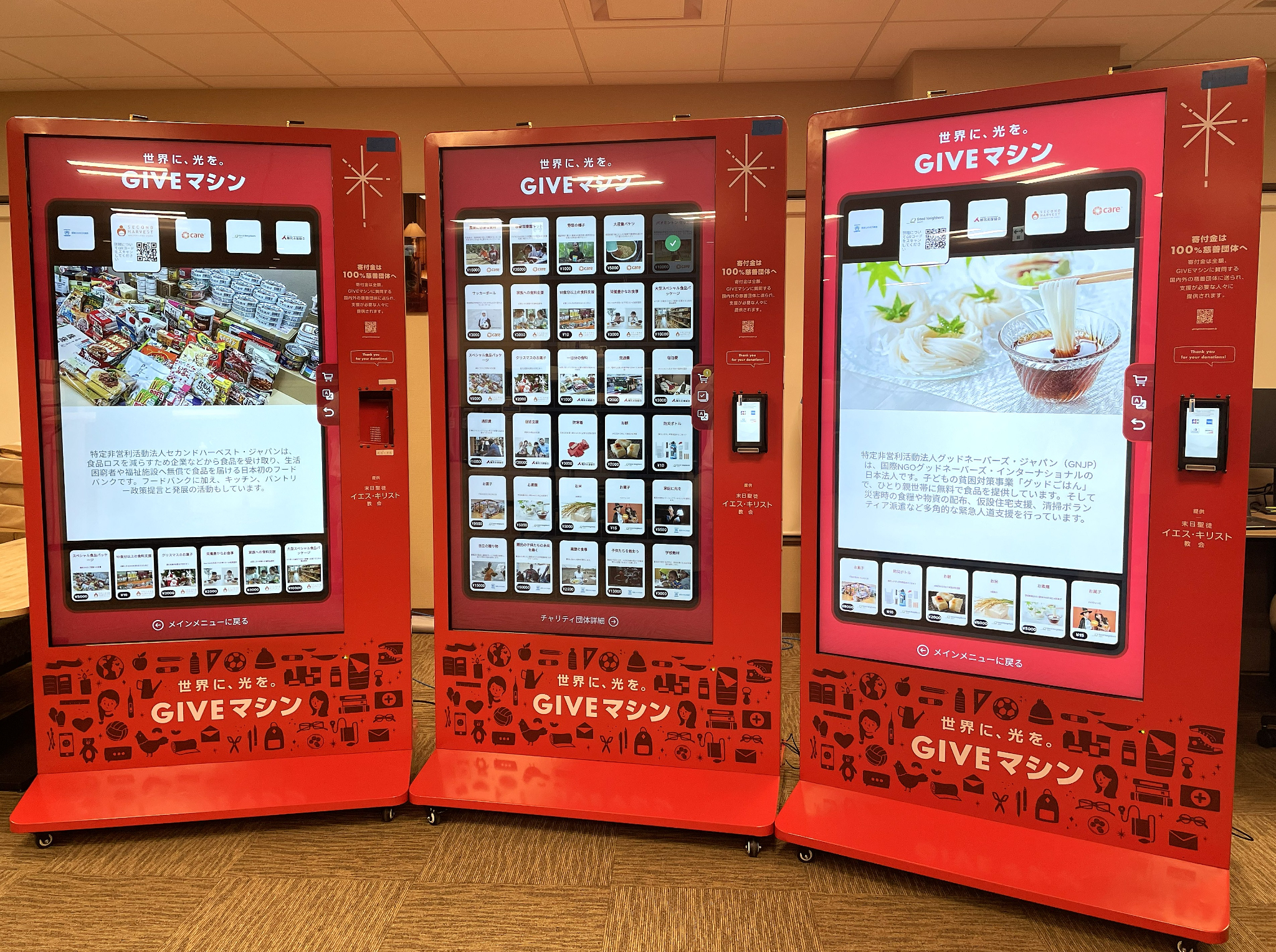 The Morimoto family visits the Tokyo Giving Machines 24 November 2025.© 2025 by Intellectual Reserve, Inc. All rights reserved.You can choose from 30 different items, ranging from food and textbooks to farm supplies and sports equipment. Each item represents a donation to a local or international charity. The Church of Jesus Christ of Latter-day Saints covers all operating costs, ensuring that 100% of your donation goes to trusted charities.